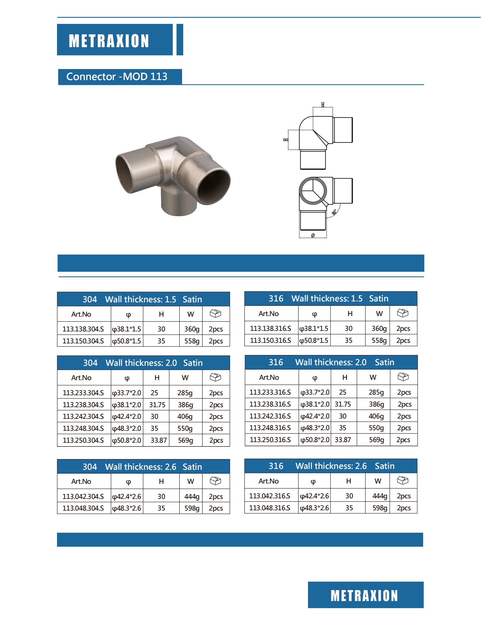 1. El conector está diseñado para ofrecer una solución robusta y fiable para conectar tres secciones de barandilla o tubería en una unión de esquina. Es fácil de instalar y ajustar, garantizando un ajuste seguro a su sistema de barandilla. Está disponible con espesores de pared de 1,5/2,0/2,6 mm, lo que lo hace versátil y adaptable a diversos sistemas de pasamanos.