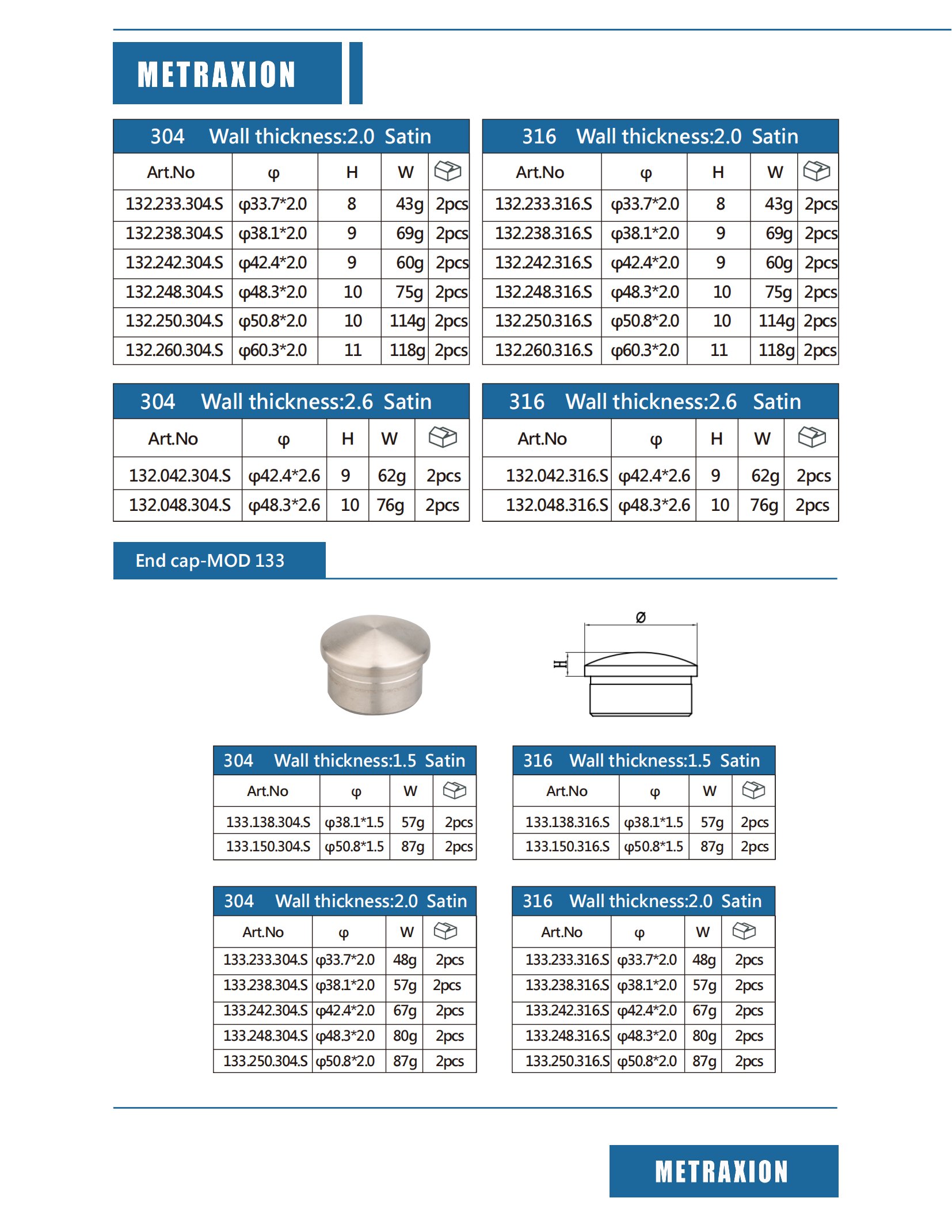 1. La tapa está diseñada para una amplia gama de aplicaciones, ofreciendo una solución elegante y duradera para el acabado de barandillas, tubos y postes. Proporciona un acabado elegante y seguro para postes y columnas de barandillas. Está disponible con espesores de pared de 1,5/2,0 mm.