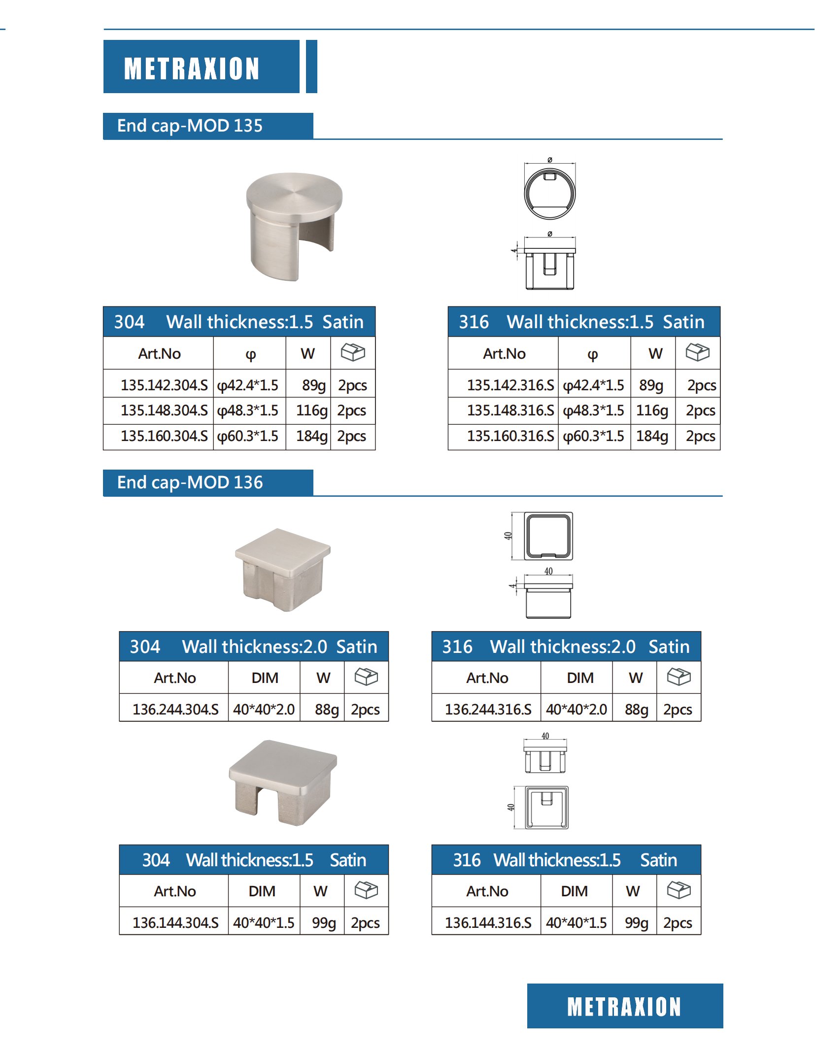 1. La tapa redonda está diseñada para un ajuste seguro y proporciona un acabado liso y profesional a los extremos de tubos y postes. Evita la entrada de residuos en postes huecos, mejorando la integridad estructural general y la durabilidad de su sistema de barandilla. La tapa, con una mitad ahuecada o parcialmente abierta, facilita su manejo e instalación. Está disponible con espesores de pared de 1,5/2,0 mm.