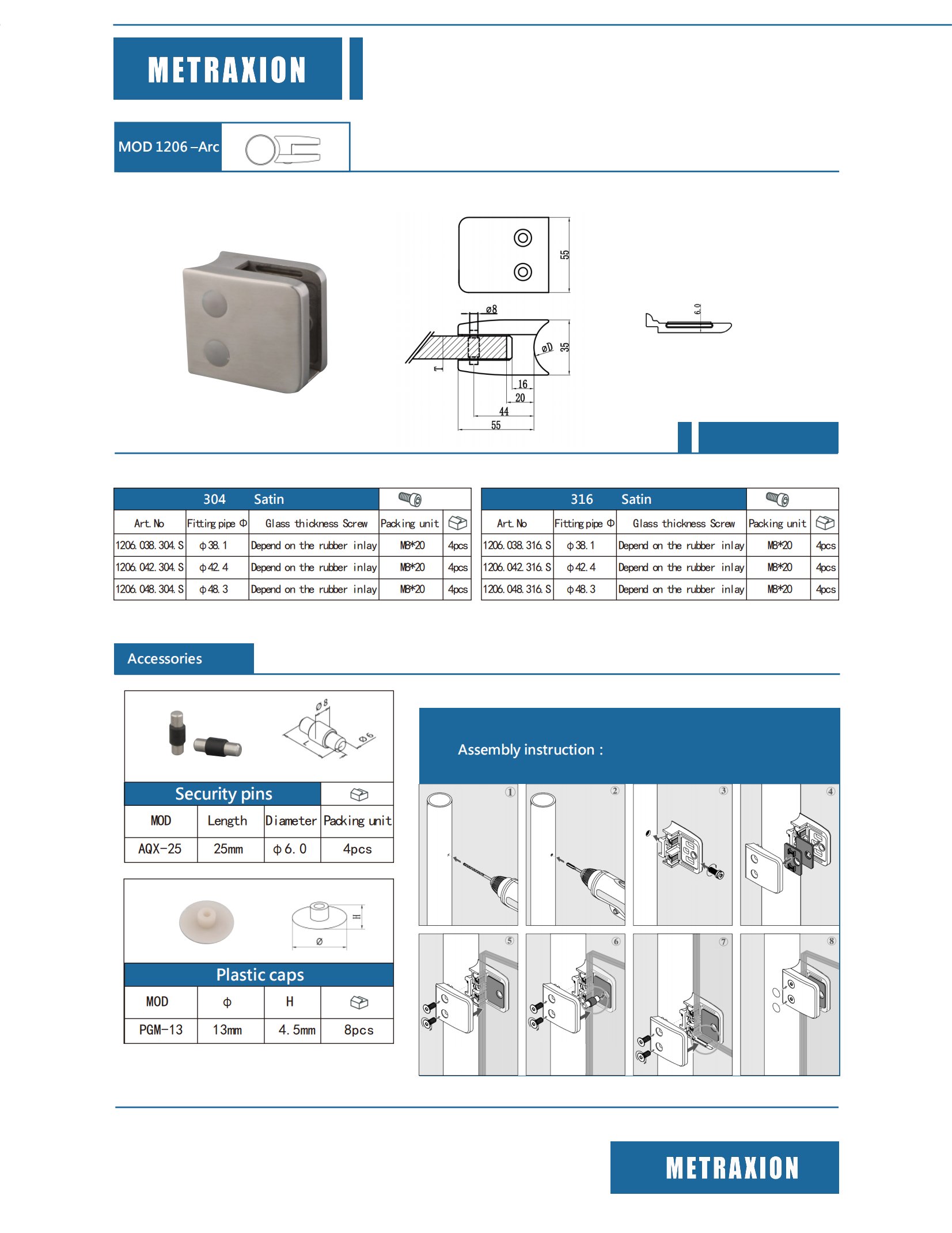 4. Cada paquete incluye 4 abrazaderas para vidrio, 8 tornillos M6*20, 4 tornillos M8*20, 8 juntas de goma, 8 tapas de plástico para tornillos laterales (diámetro de 13 mm y altura de 4,5 mm) y 4 pasadores de seguridad (longitud de 25 mm y diámetro de 6,0 mm). Para adaptarse a vidrios de diferentes grosores, proporcionamos suficientes juntas (hechas de goma de alta calidad) en 3 tamaños: 5/16 (8 mm), 3/8 (10 mm) y 1/12 (12 mm). Puede usar incrustaciones de goma adecuadas para colocar vidrios de diferentes grosores ajustando los tornillos.