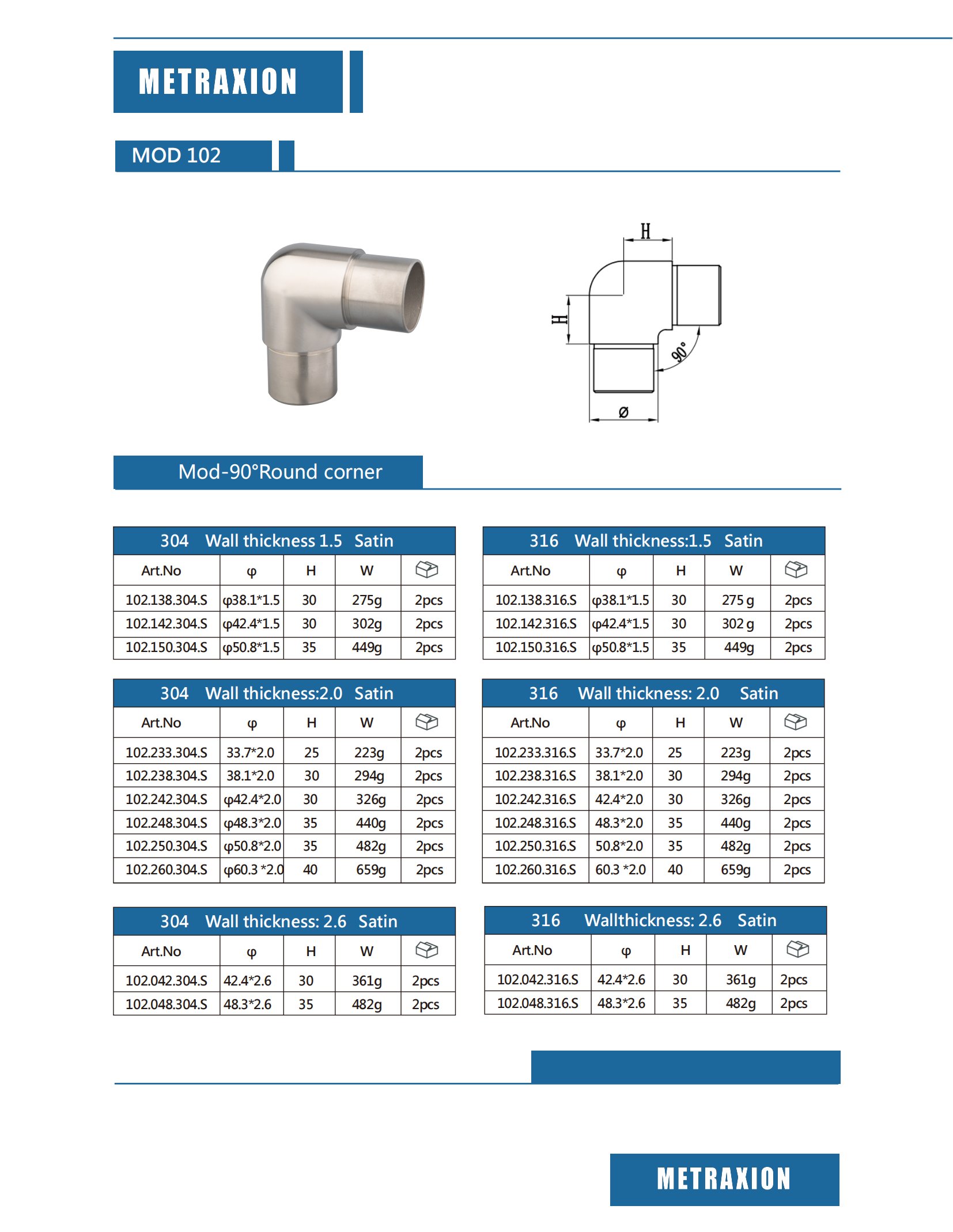 1. El conector para pasamanos está diseñado para una unión de esquina redondeada de 90°. Ofrece una transición suave entre dos pasamanos, garantizando una conexión segura y sin fisuras con mínimas holguras visibles. El conector está disponible con espesores de pared de 1,5/2,0/2,6 mm, lo que lo hace versátil y adaptable a diversos sistemas de pasamanos, desde instalaciones residenciales hasta comerciales.