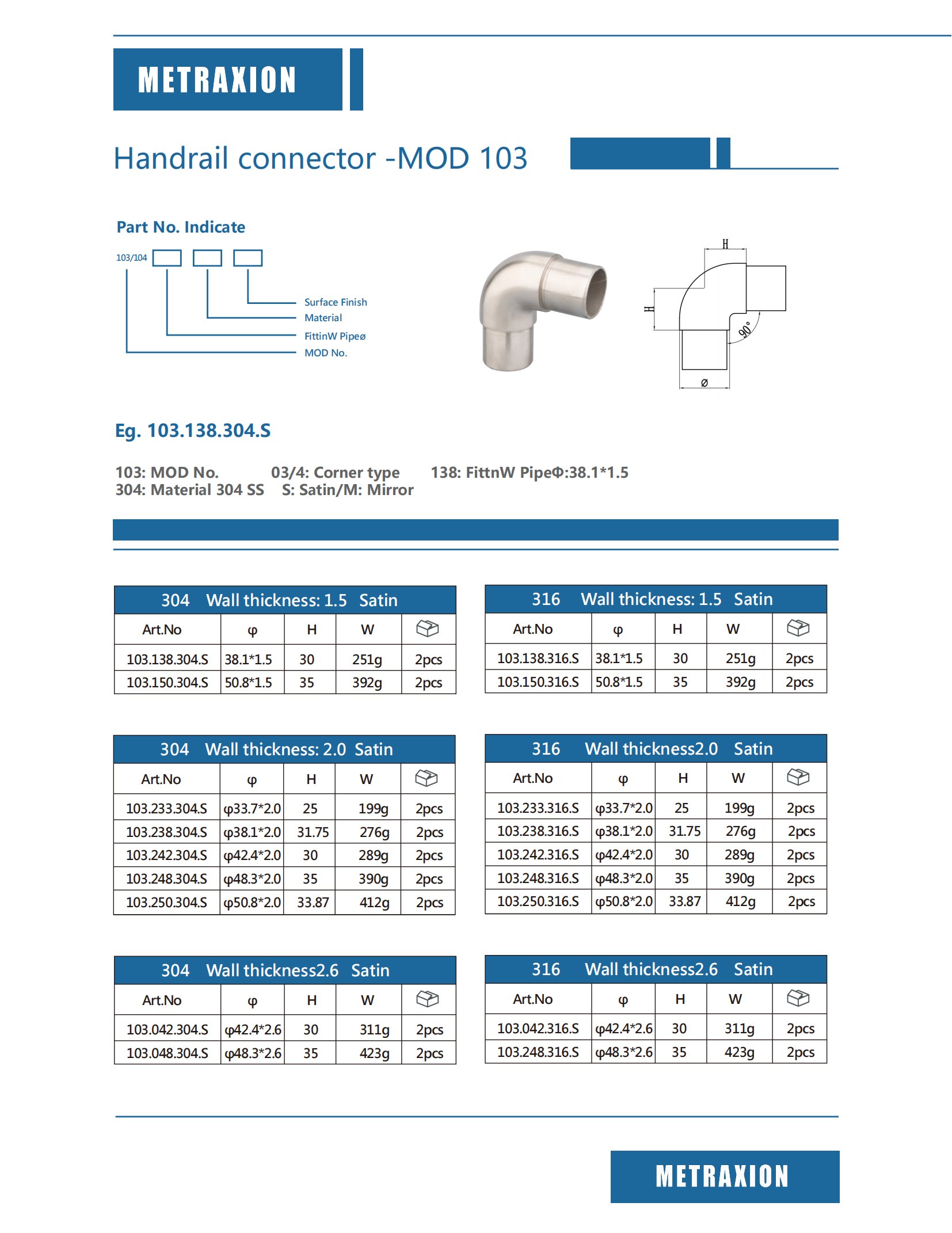 1. El conector para pasamanos está diseñado para una unión de esquina redondeada de 90°. Ofrece una transición suave entre dos pasamanos, garantizando una conexión segura y sin fisuras con mínimas holguras visibles. El conector está disponible con espesores de pared de 1,5/2,0/2,6 mm, lo que lo hace versátil y adaptable a diversos sistemas de pasamanos, desde instalaciones residenciales hasta comerciales.
