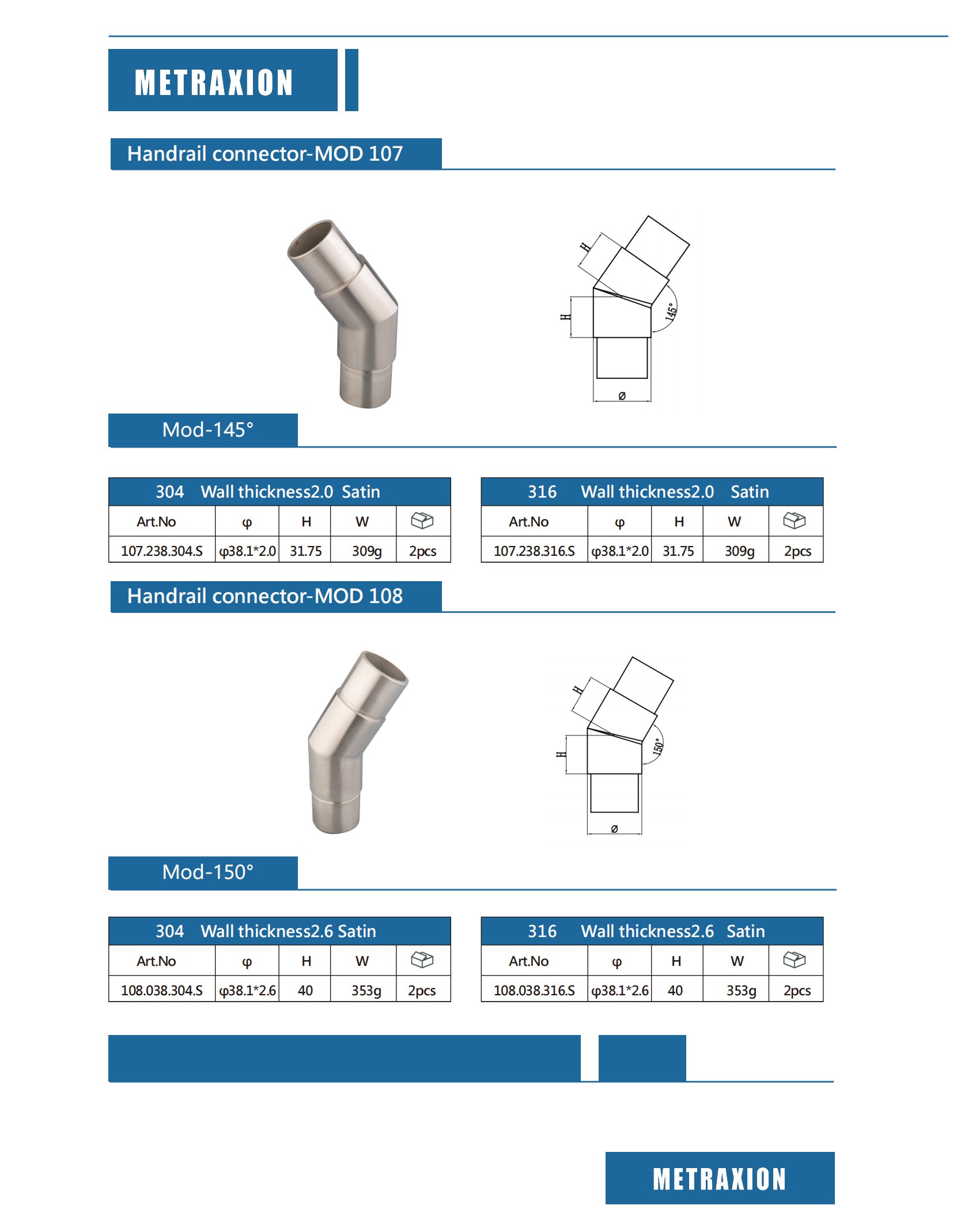 1. El conector para pasamanos está especialmente diseñado para uniones de esquina de 150°, lo que proporciona una solución robusta y sin fisuras para la conexión de pasamanos redondos, garantizando tanto la estética como la integridad estructural. Ofrece una transición entre dos pasamanos, asegurando una conexión segura y sin fisuras con mínimas holguras visibles. Está disponible con espesores de pared de 2,6 mm y es compatible con tuberías de φ38,1 x 2,6 mm.