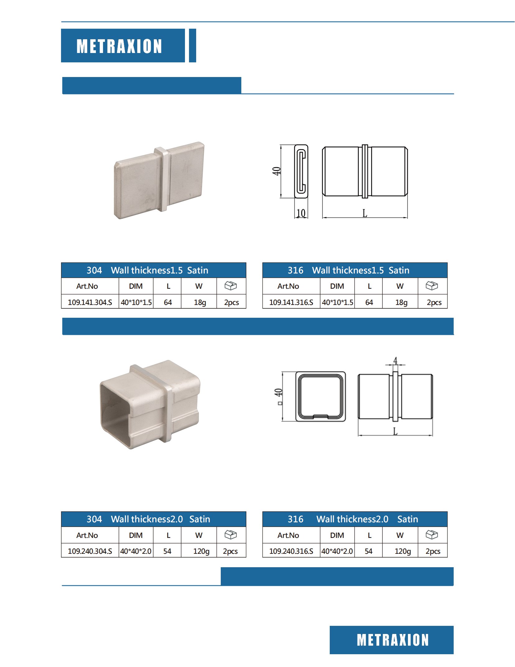 1. El conector está diseñado para conectar tubos planos y cuadrados en pasamanos. Garantiza una conexión robusta y sin fisuras entre los tubos. La parte saliente central del conector evita que se deslice o gire durante el uso, manteniendo así la estabilidad general de la estructura. Está disponible con un espesor de pared de 1,5 mm y tubos cuadrados de 40 x 10 x 1,5 mm.