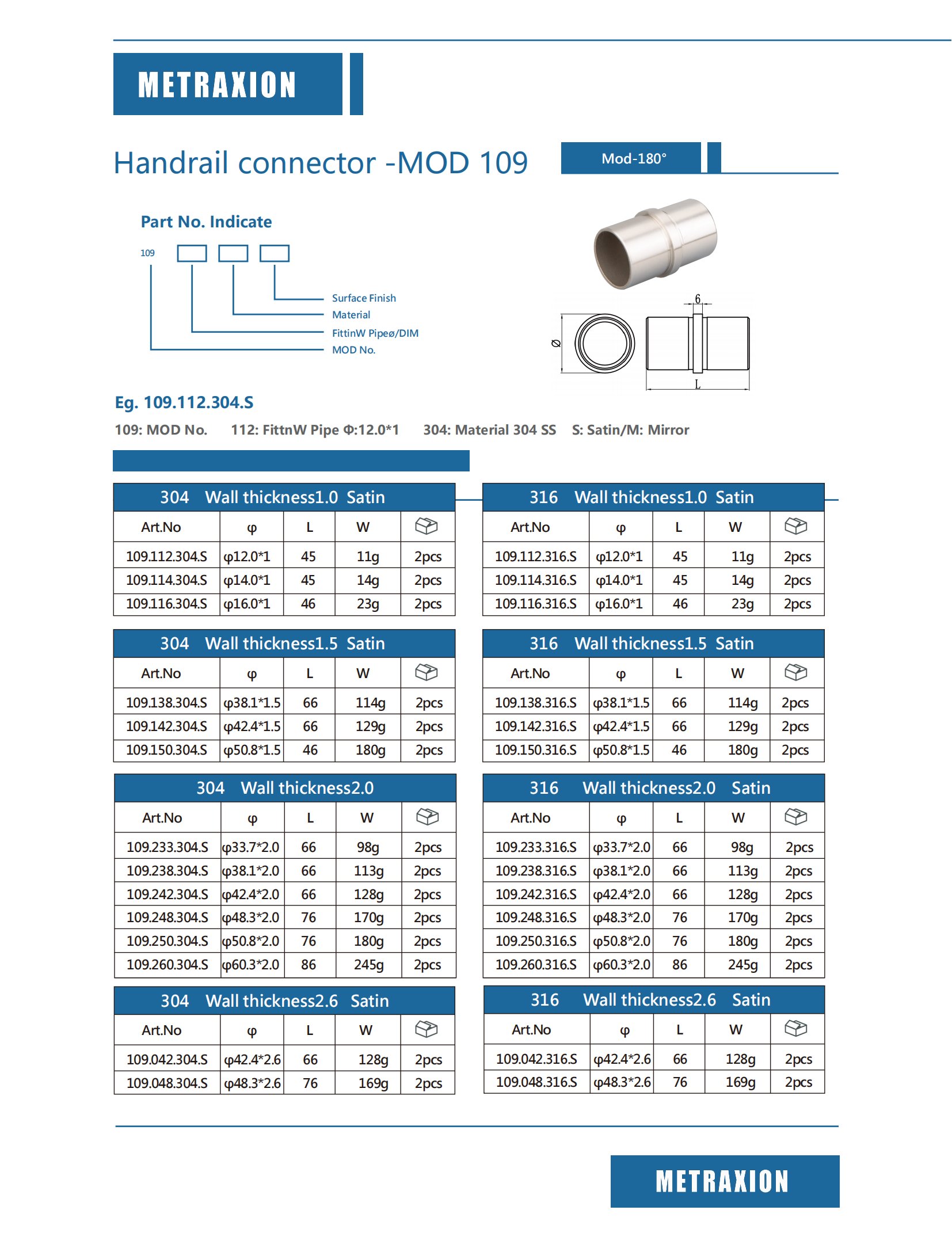 1. El conector para pasamanos está diseñado para conectar tuberías o barandillas directamente. Su fabricación garantiza una conexión perfecta con mínimas holguras visibles. El anillo saliente en el centro del conector ayuda a asegurar una conexión más firme. Está disponible con espesores de pared de 1,0/1,5/2,0/2,6 mm.